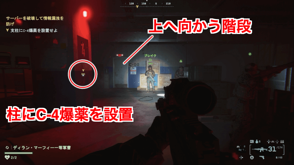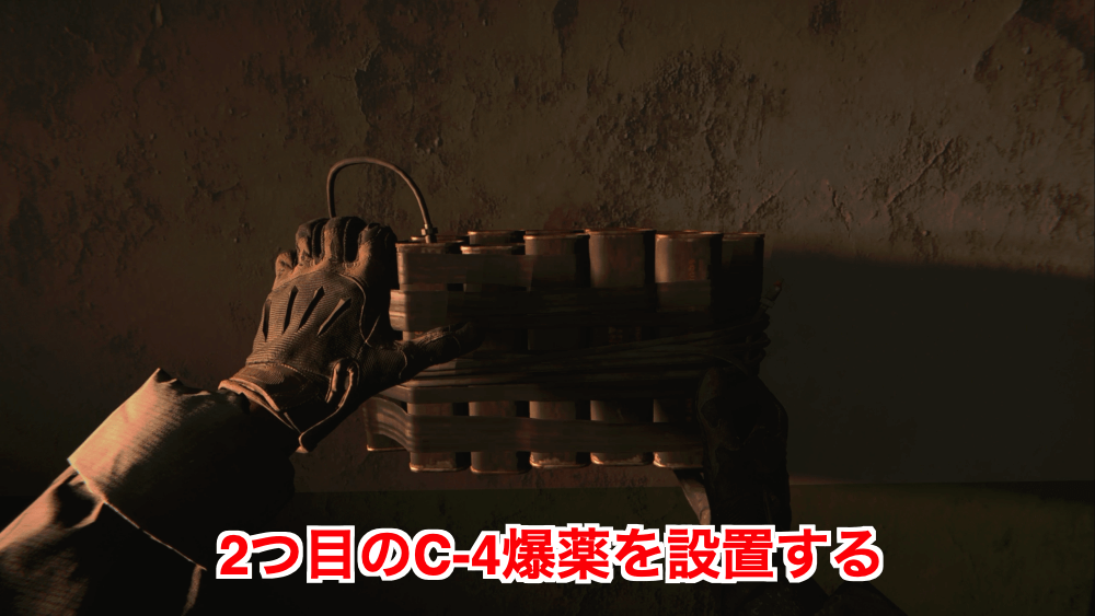 上の階へ進んだら、正面に見える柱に2つ目のC-4爆薬を設置する。敵は出現しないため、C-4爆薬を設置したらそのまま奥へ進もう。