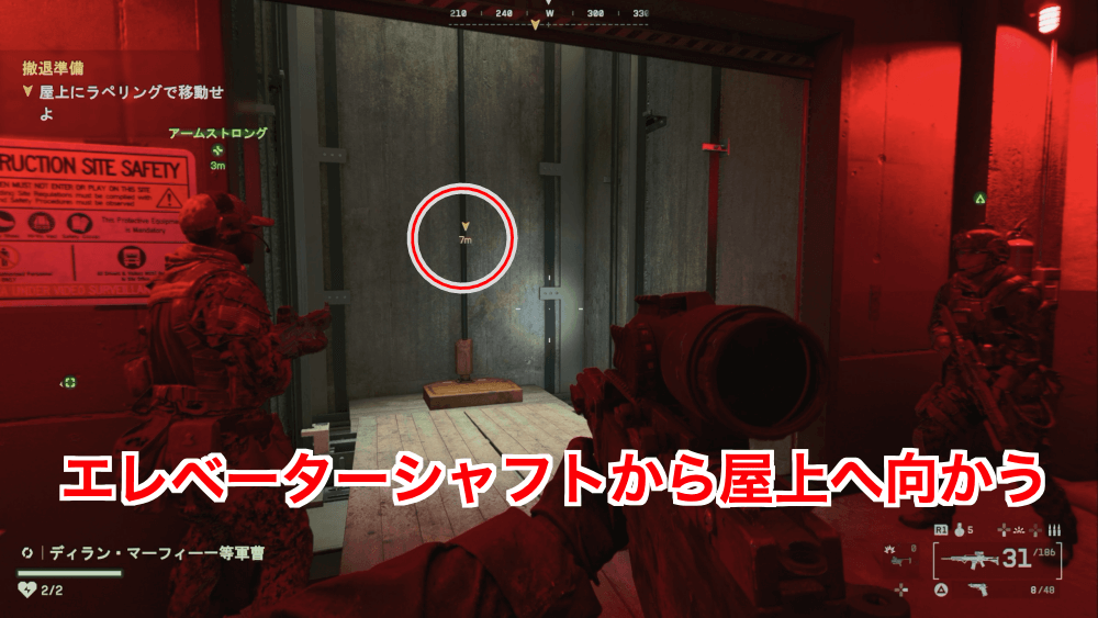 2つ目のC-4爆薬を設置したら、奥にあるエレベーターシャフトに向かい、ラペリングで屋上に移動しよう。エレベーターシャフトの手前や、屋上に上がってすぐの場所で弾薬を拾えるので、満タンでない場合は拾っておくと良い。