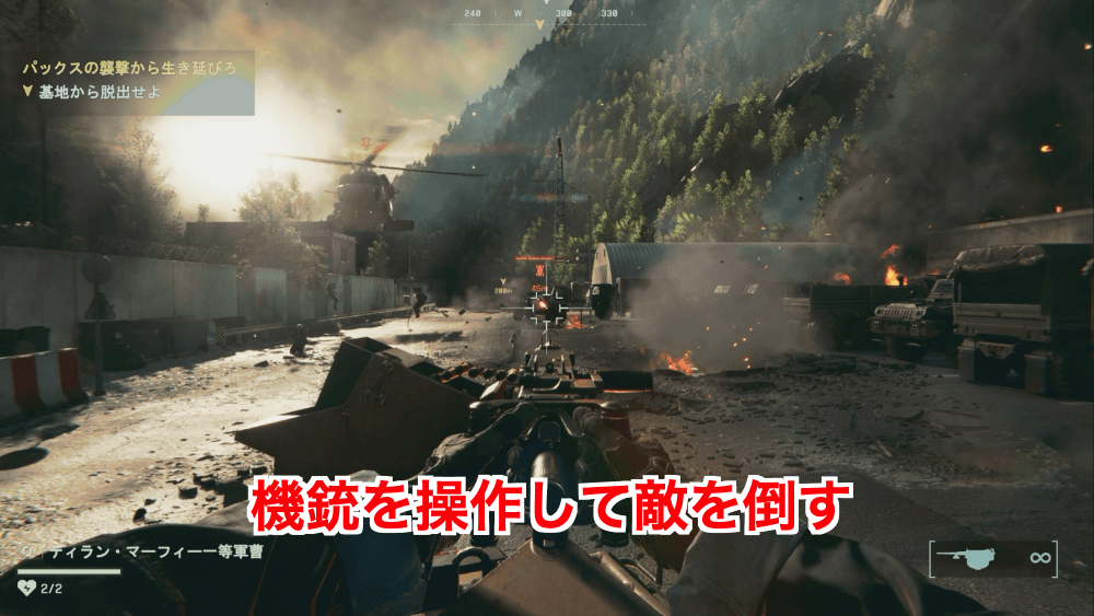 車両に乗り込んだら、車両に搭載された機銃を操作して敵を倒しつつ、基地を脱出しよう。車両の運転操作は自動で行われるため、機銃の操作に集中して敵を倒すと良い。
