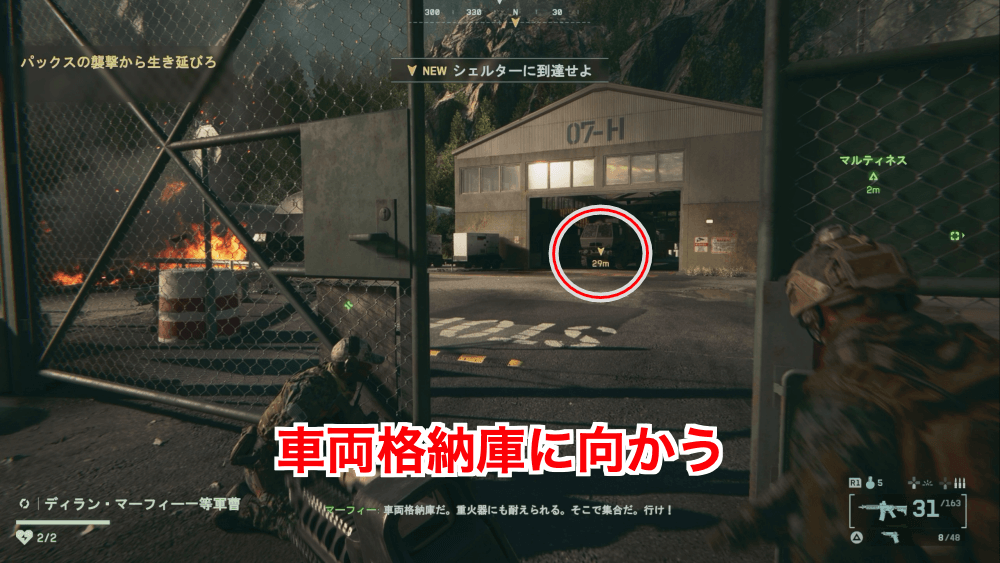 接近中の敵を倒したら正面へ進み、フェンスの奥に見える車両格納庫へ向かおう。フェンスを越えると自動で進み、爆撃を受けて車両に乗り込む。