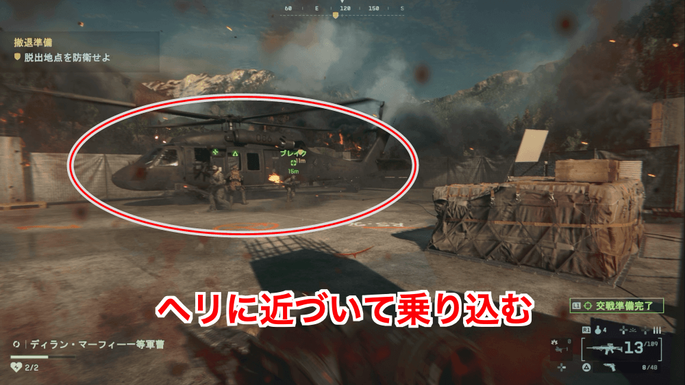ヘリが到着したら、到着したヘリに近づいて乗り込もう。屋上の敵をすべて倒す必要は無いため、ヘリの音が聞こえたら位置を確認し、味方が乗り込み始めたタイミングで近づくとスムーズに乗れる。