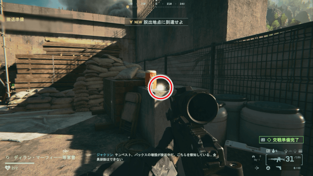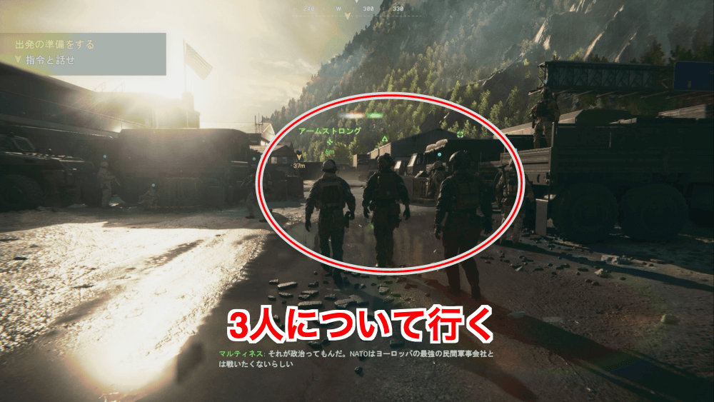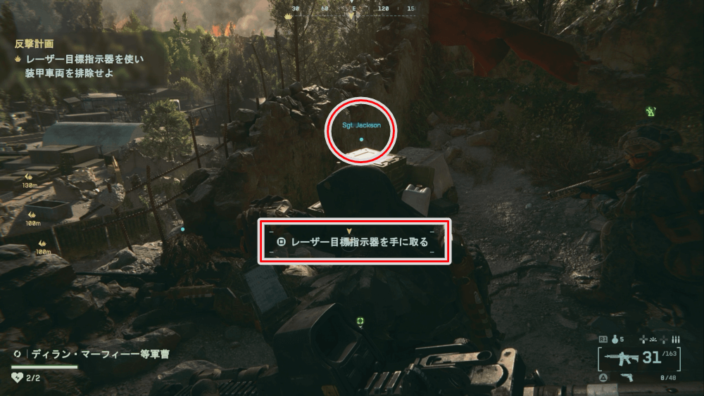 スナイパー分隊と合流して会話を終えたら、レーザー目標指示器を受け取ろう。レーザー目標指示器は、Sgt.Jacksonから受け取れる。
