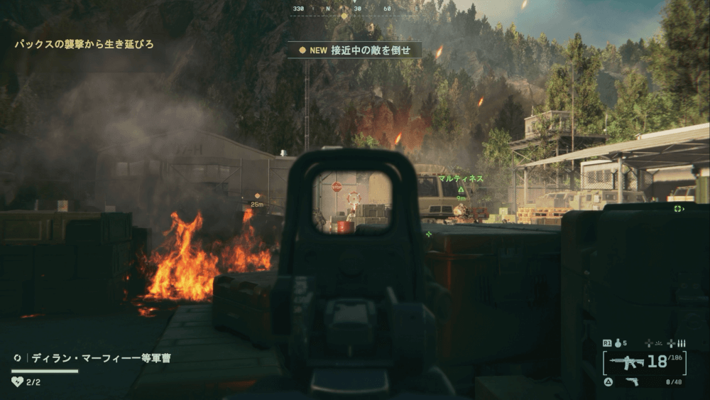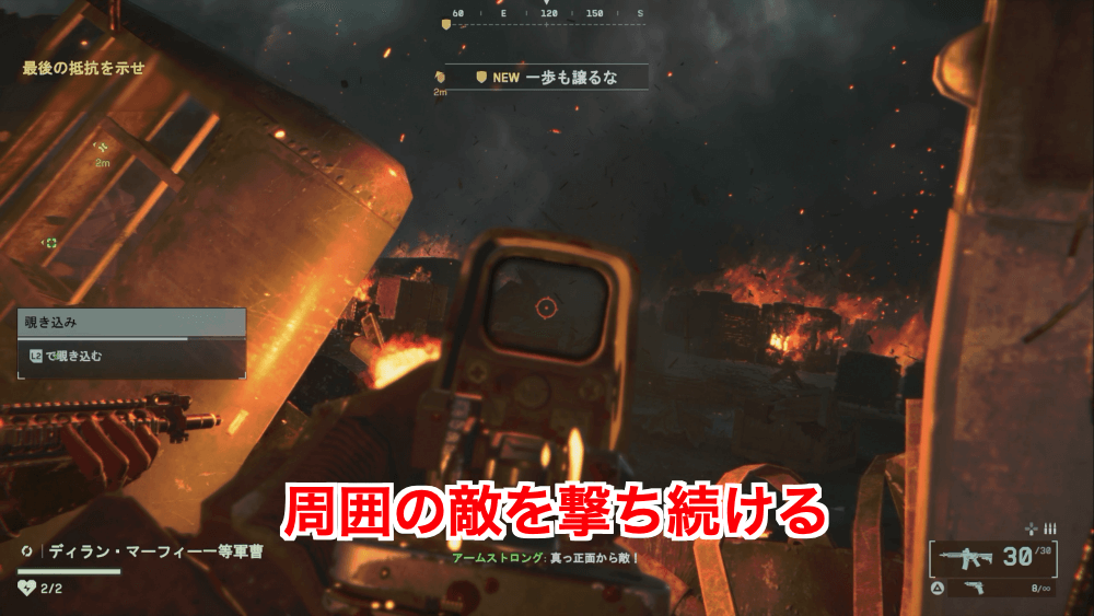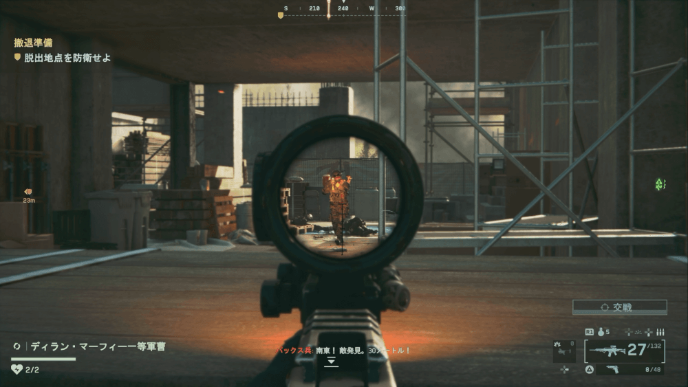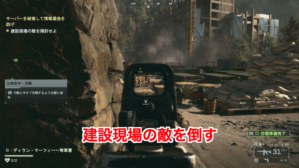 爆撃後、分隊との会話を終えたら建設現場に向かい、敵を掃討しよう。分隊に交戦命令を出し、遮蔽を使って戦うと良い。