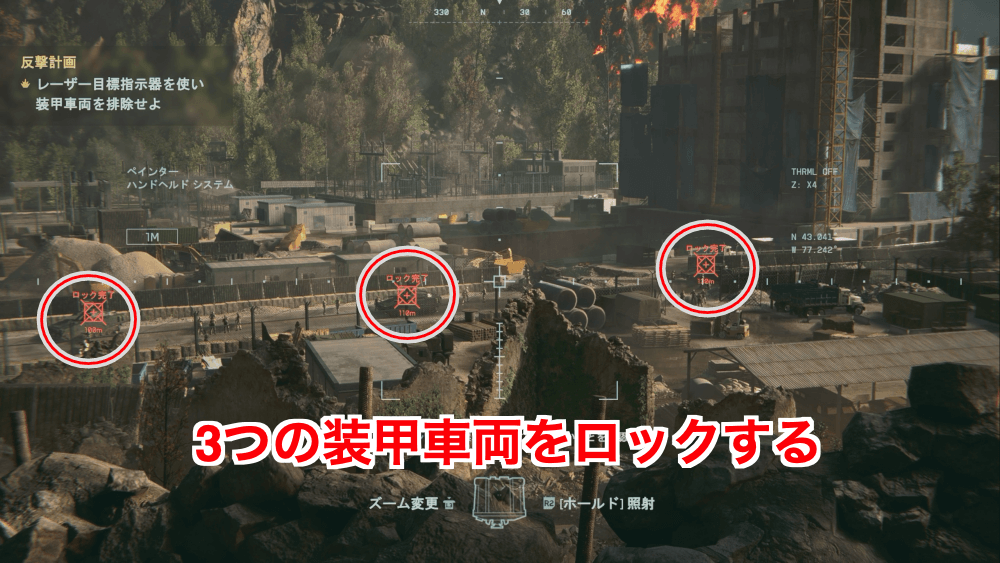 レーザー目標指示器を受け取ったら、正面に見える3台の装甲車両をマークしよう。照準を合わせて