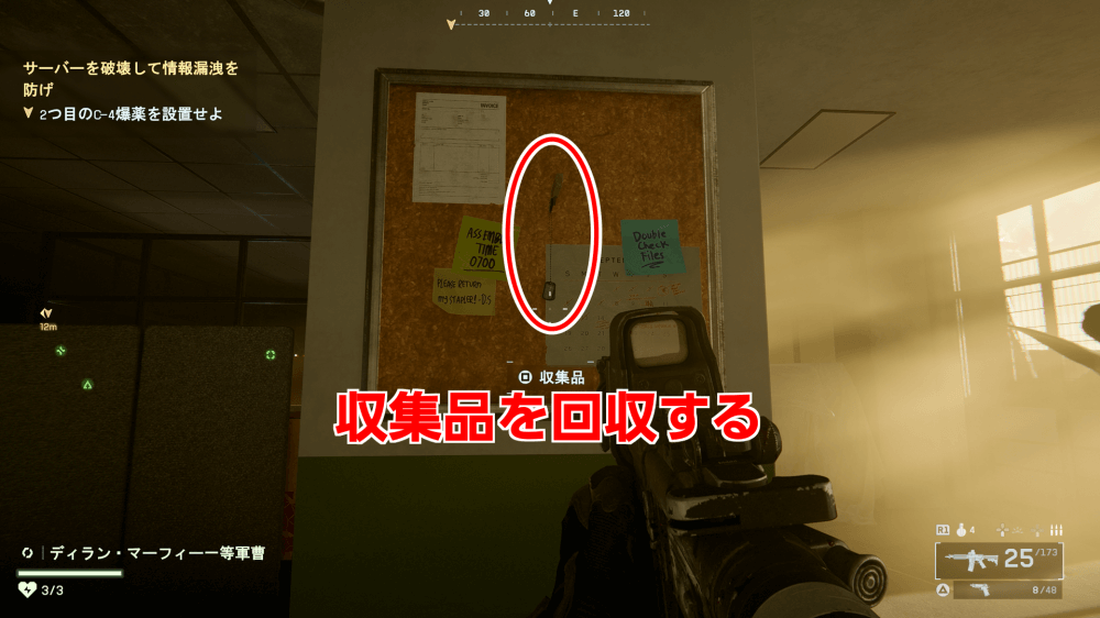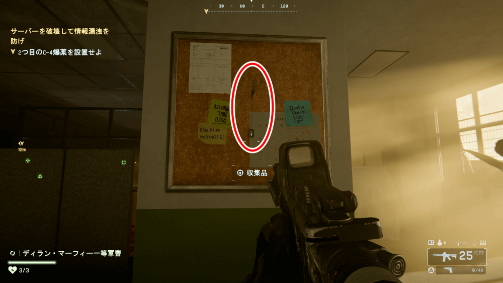 2階の柱にC-4を設置したら、屋上に移動する前に収集品を回収しよう。C-4を設置した柱から陽の光が射し込む窓側の道を進むと、最初の柱の裏側にナイフで固定されたドックタグを回収可能だ。