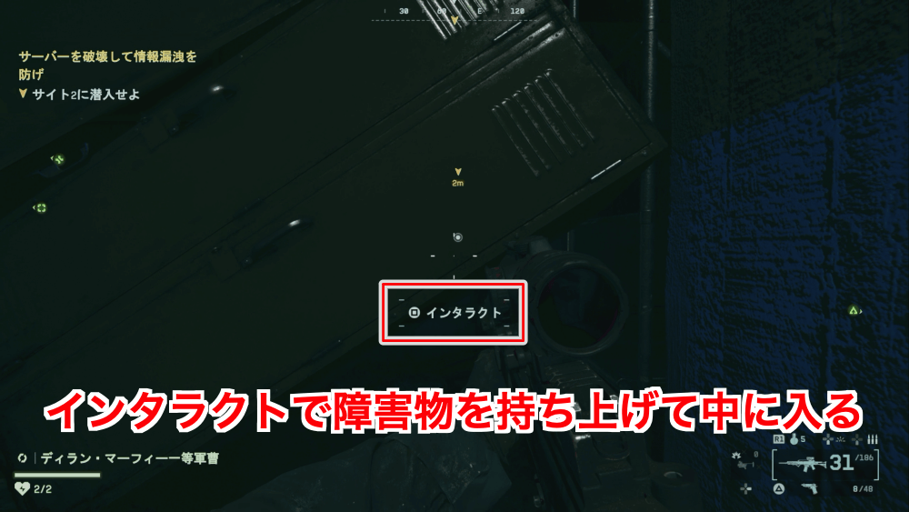 建設現場の敵を倒したら、入口の遮蔽物にインタラクトするとサイト2に潜入できる。支柱がある部屋まで進むと敵が出現するため、倒して奥へ進もう。