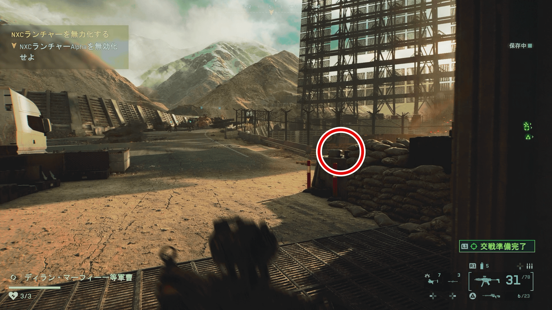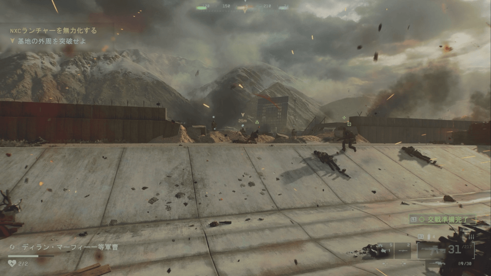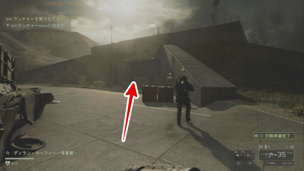 基地へ侵入したら、敵を倒しつつMCXランチャーAlphaを目指す。敵の数が多いため、無理な突撃はせず、味方と連携して少しずつ前線を押し上げるのが重要だ。