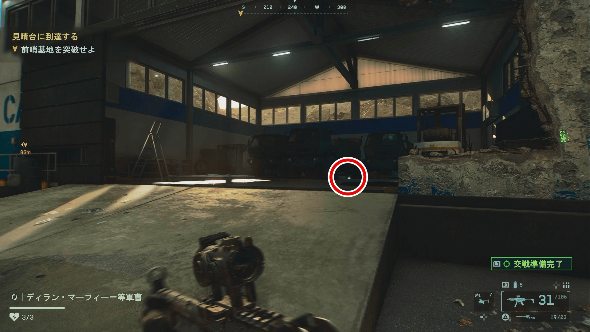 前哨基地の奥にある倉庫には、最初の収集品が落ちている。倉庫内の車両のすぐ近くに落ちているため、見逃さずに拾おう。