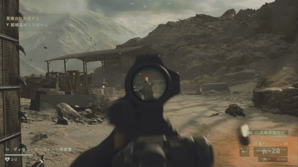 常に前進開始後に少し進むと、前哨基地がある。前哨基地には固定兵器もあるため、榴弾ランチャーなどで先に破壊し、残りの兵士も倒しながら進もう。