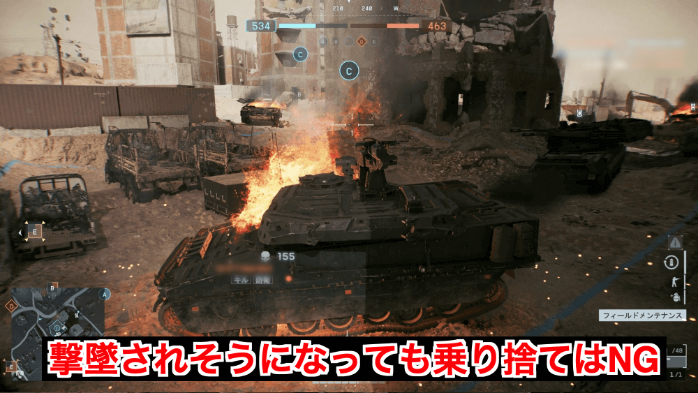 戦車や航空機などの乗り物は、敵に奪われると歩兵では覆しにくい戦力差が生まれてしまうため、絶対に乗り捨ててはいけない。操縦役になった場合は決して降りず、敵に奪われる場所に放置しないように注意しよう。