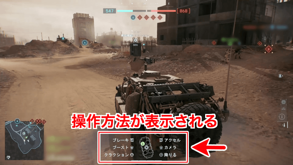 乗り込むと操作方法が画面下部に表示される