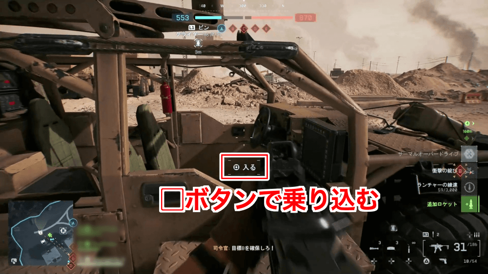 乗り物に乗り込むと、画面下部に簡易的な操作方法が表示される。地上車両は簡易操作を見るだけで直感的に操作できるが、ヘリや航空機は慣れていないと難しいため、ある程度練習してから乗るのがおすすめだ。