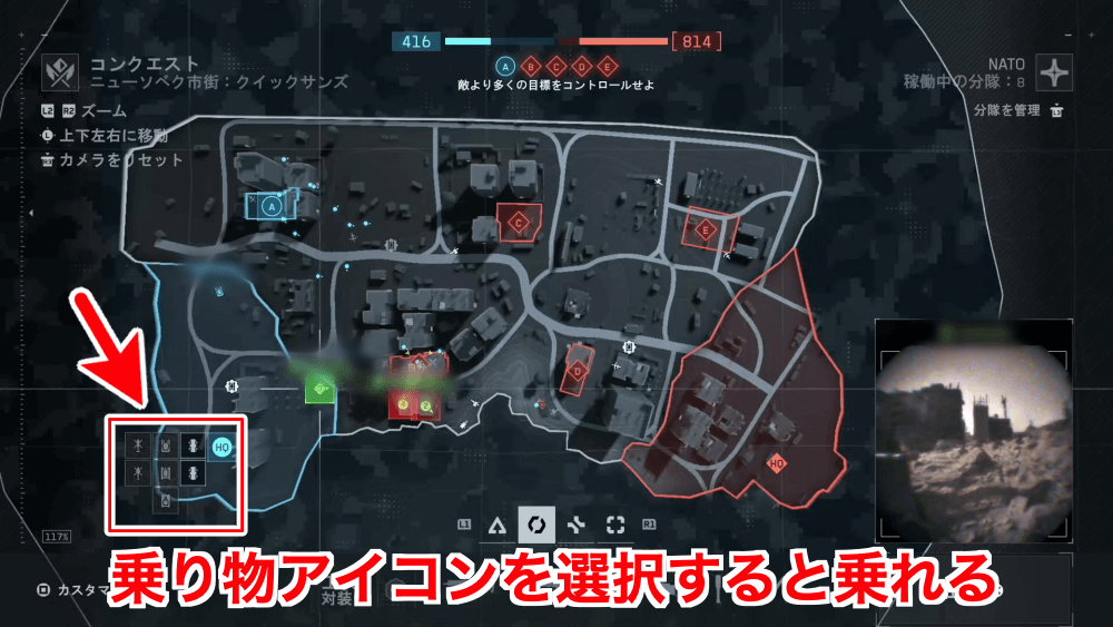 乗り物には、リスポーン時に直接乗る方法もある。リスポーン地点選択のマップ画面で、拠点にある乗り物アイコンを選択すると、選択した乗り物に乗った状態でリスポーンが可能だ。ただし、乗り物に空きが無いと選択できないため、選べない時は大人しく歩兵としてリスポーンしよう。