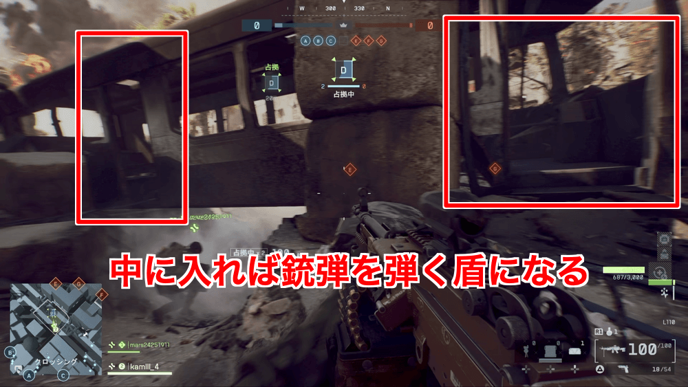 中央拠点の真ん中には廃車があり、銃弾を守る壁として活用できる。伏せ状態であれば比較的安全になるため、ダメージを負ったら隠れてやり過ごそう。対策無しではグレネードには弱いため、援護兵がGPDISを設置し、無効化している間に占拠防衛を進めるのがおすすめだ。