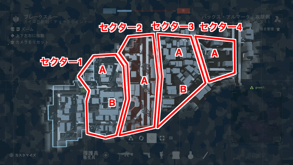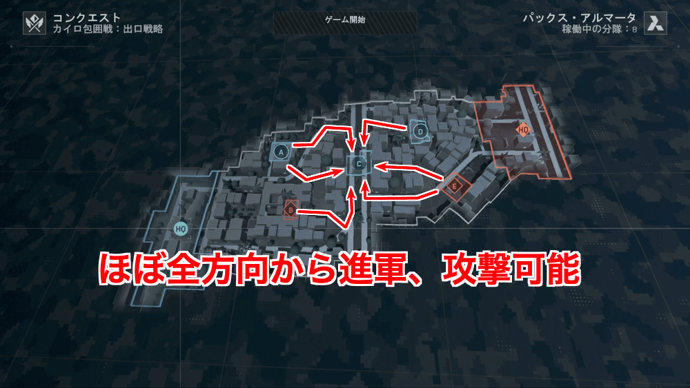 ほぼ全ての占拠エリアが屋外に設置されており、進行ルートを限定されやすいため、拠点を防衛する難易度が低い。敵数の多い拠点を無理に攻めず、時間をかけてでも戦力を削ってから占拠しよう。