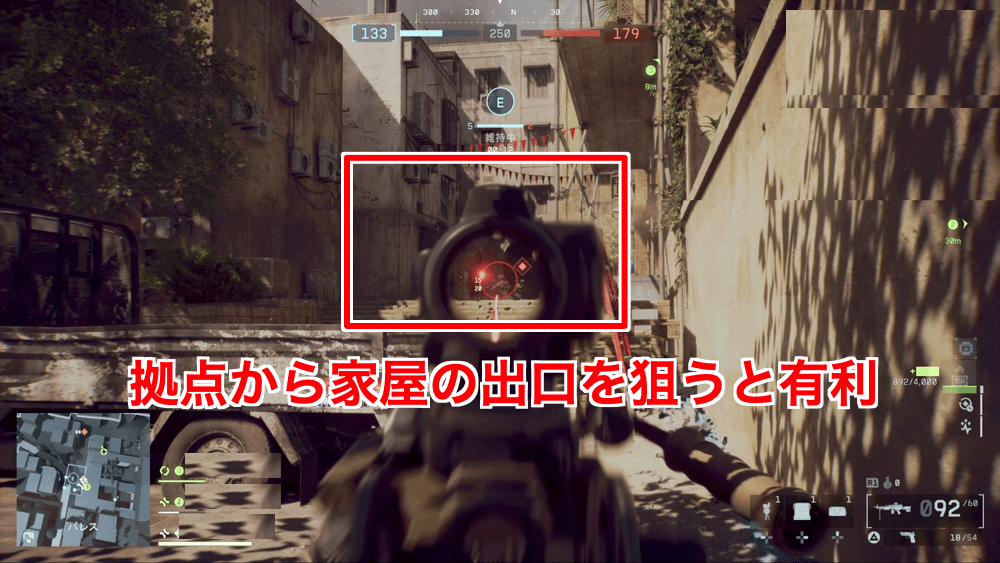 他のマップと比べて建造物が非常に多く、特に拠点周りは死角からの銃撃が効果的だ。防衛する際は、拠点周りの物陰に潜み、敵が通り過ぎた後の背後を狙って攻撃すると、安全に時間稼ぎができる。同じ場所にいるほど警戒されるため、一通り敵を倒したら移動し、別ルートの妨害へ向かうのがおすすめだ。