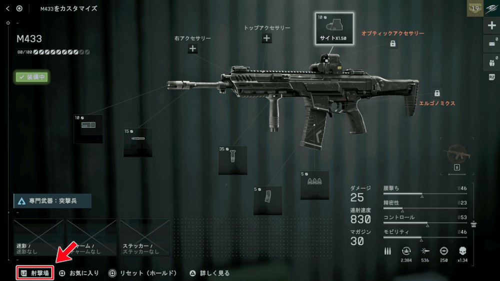 射撃場は、メインメニューのプレイからも移動可能。ただし、メインメニューから移動した場合、直近で選択していた武器で射撃場に入るため、武器選択画面から移動するのがおすすめだ。
