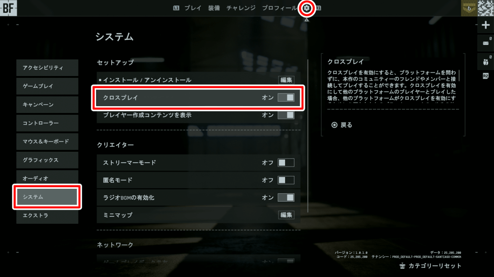 BF6はクロスプレイに対応し、全プラットフォーム同士で対戦できるうえ、異なるプラットフォーム同士でもパーティーを組める。フレンドとプラットフォームを合わせる必要が無いため、自分の環境に最適な環境で遊ぶと良い。クロスプレイのオンオフは、システムのセットアップから設定可能だ。