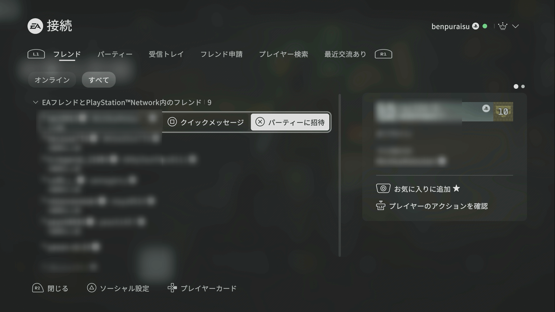 パーティを作成できたら、リーダーがフレンドを招待しよう。招待するには、予めEAアカウントでフレンドになっておく必要がある。フレンドになれたら、画面右上にあるフレンドアイコンから一覧を開き、招待したい相手を選択して「パーティーに招待」を押そう。