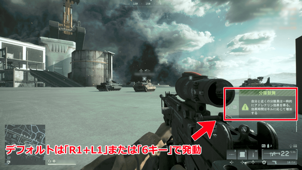分隊鼓舞自分と近くの分隊員は一時的にアドレナリン効果を得る。効果時間はキルに応じて増加する |