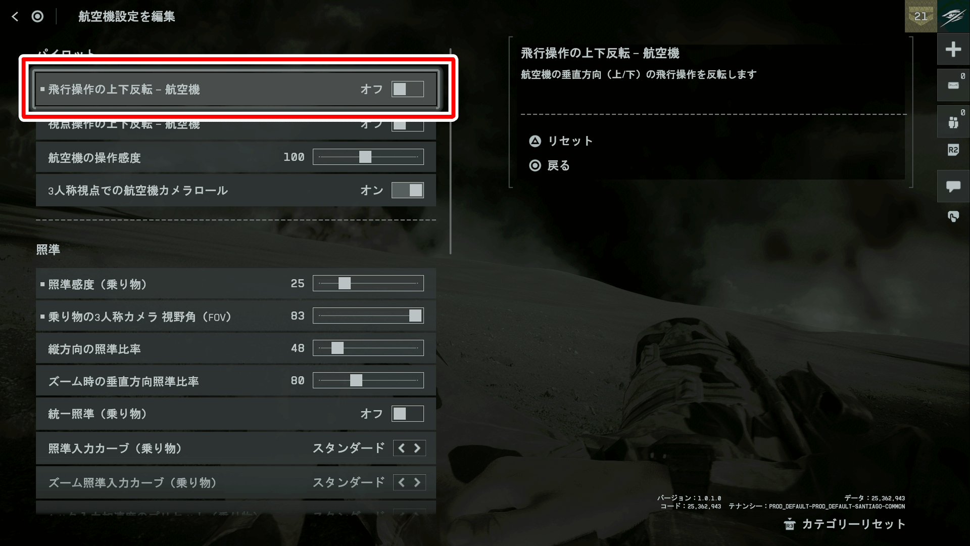 航空機に乗る時は、設定で「飛行操作の上下反転-航空機」がある。デフォルトだとオンになっているが、上下が反転すると直感的な操作がしにくいため、基本的にはオフにするのがおすすめだ。