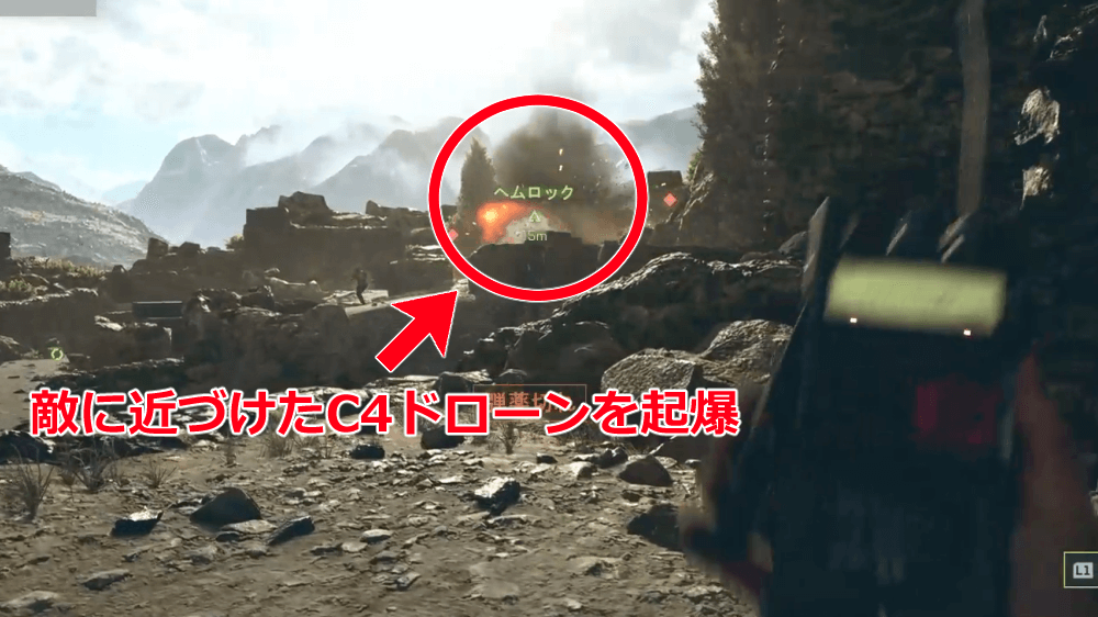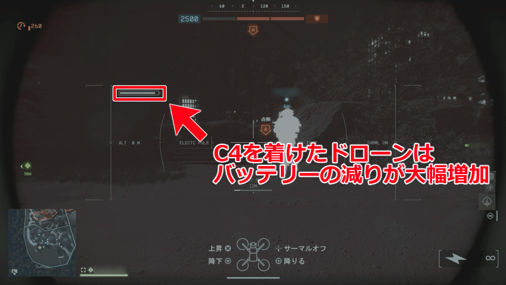 ドローンに解体爆薬を付けると、ドローンのバッテリー減少量が大幅増加する。過去作のように超遠距離からのC4ドローン爆撃は不可能であるため、爆破したい対象に30~40mくらいの距離まで近づいてから、ドローンに解体爆薬を付けるのがおすすめだ。