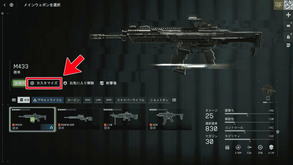 カスタマイズは、装備から兵科を選び、武器を選んでからカスタマイズ画面を開くと変更できる。まずはカスタマイズを変えたい武器を選ぼう。