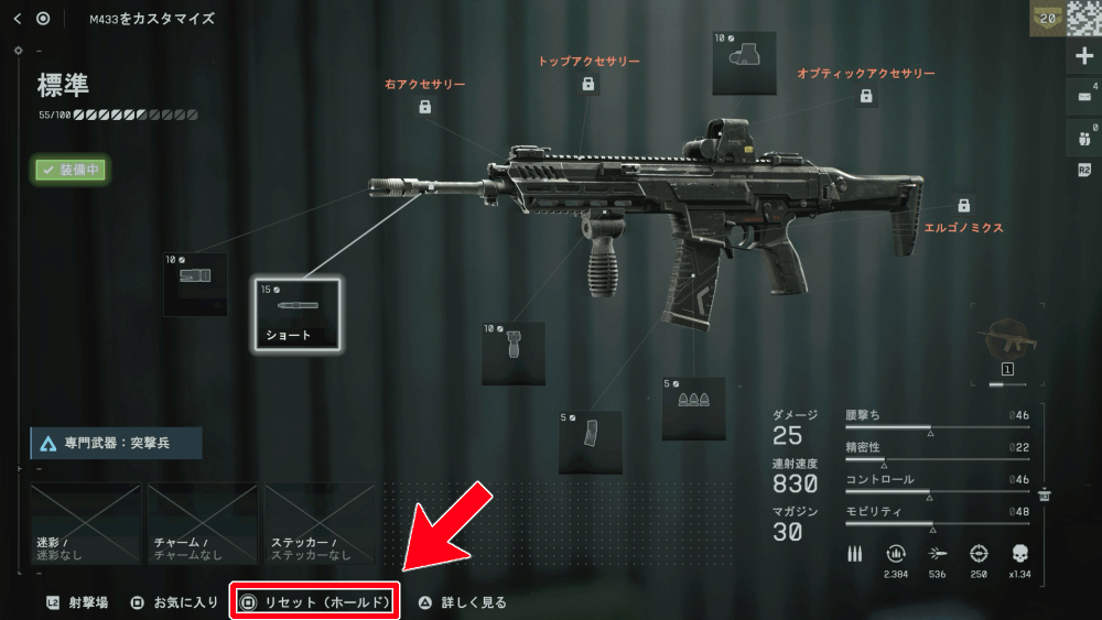 カスタマイズの状態は、初期状態にリセットも可能だ。どのボタンでリセットできるかはコントローラーによって変わるため、画面左下を確認しよう。