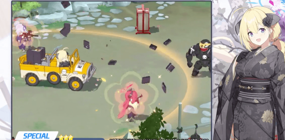 貫通効果のない直線攻撃に対しても有効で、正月アカリの車両で受ければ後ろの味方の被弾を抑えられる。運用次第で他のキャラには真似できない活躍が可能だ。