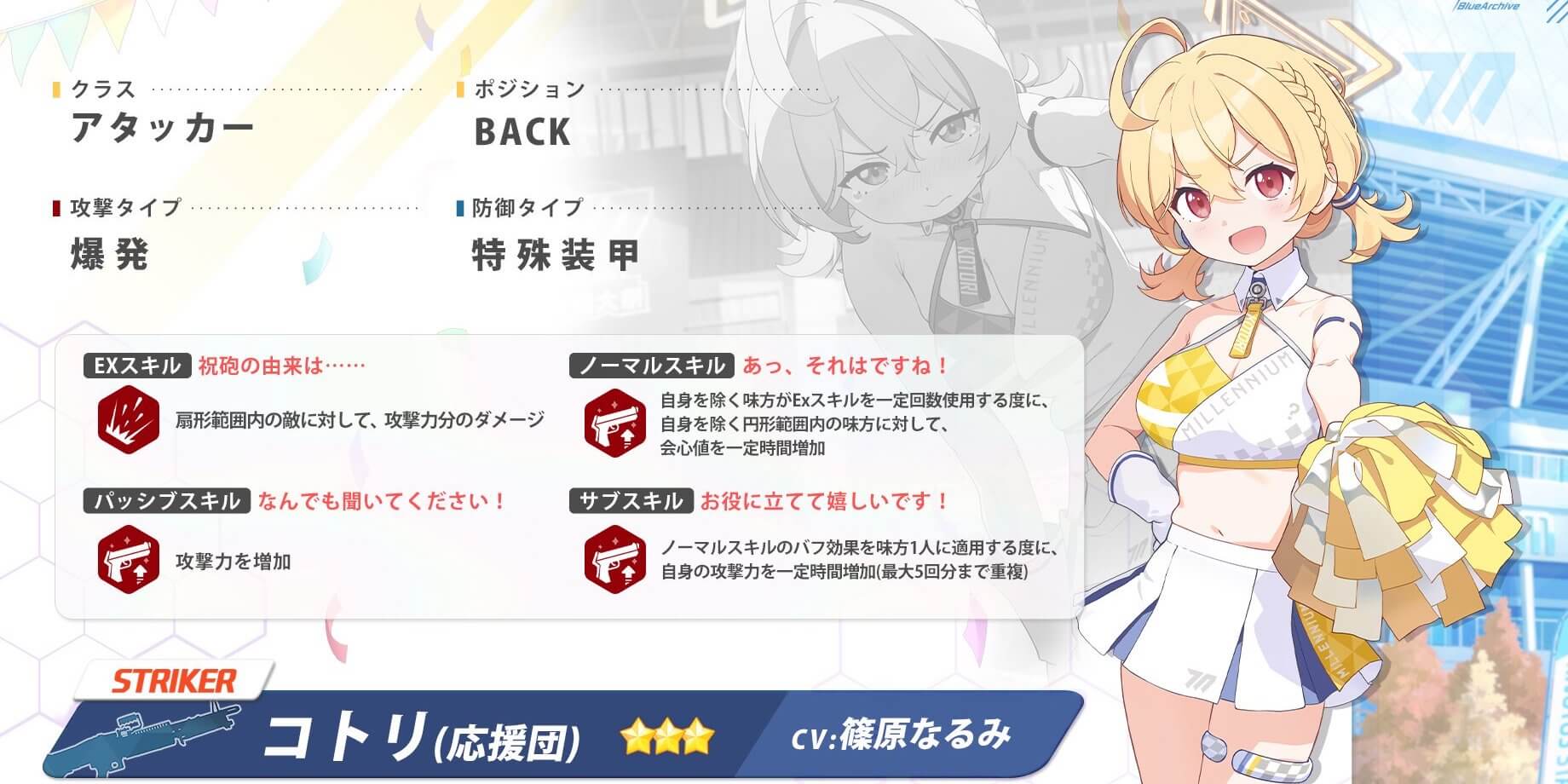 ブルアカ(ブルーアーカイブ)の応援団コトリPUガチャ(明け空に説く こころ模様)を紹介。PUガチャを引くべきかどうかの解説をはじめ、ガチャシミュや新キャラ「応援団コトリ」の評価も掲載しているので、ブルアカの応援団コトリPUガチャについて知りたい際の参考にどうぞ!