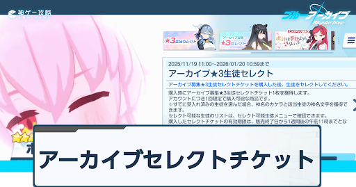 ブルアカ(ブルーアーカイブ)のアーカイブセレクトチケットとおすすめ選択キャラについて解説。アーカイブセレクトチケットは買うべきかも掲載しているため、ブルアカをプレイする際の参考にどうぞ!