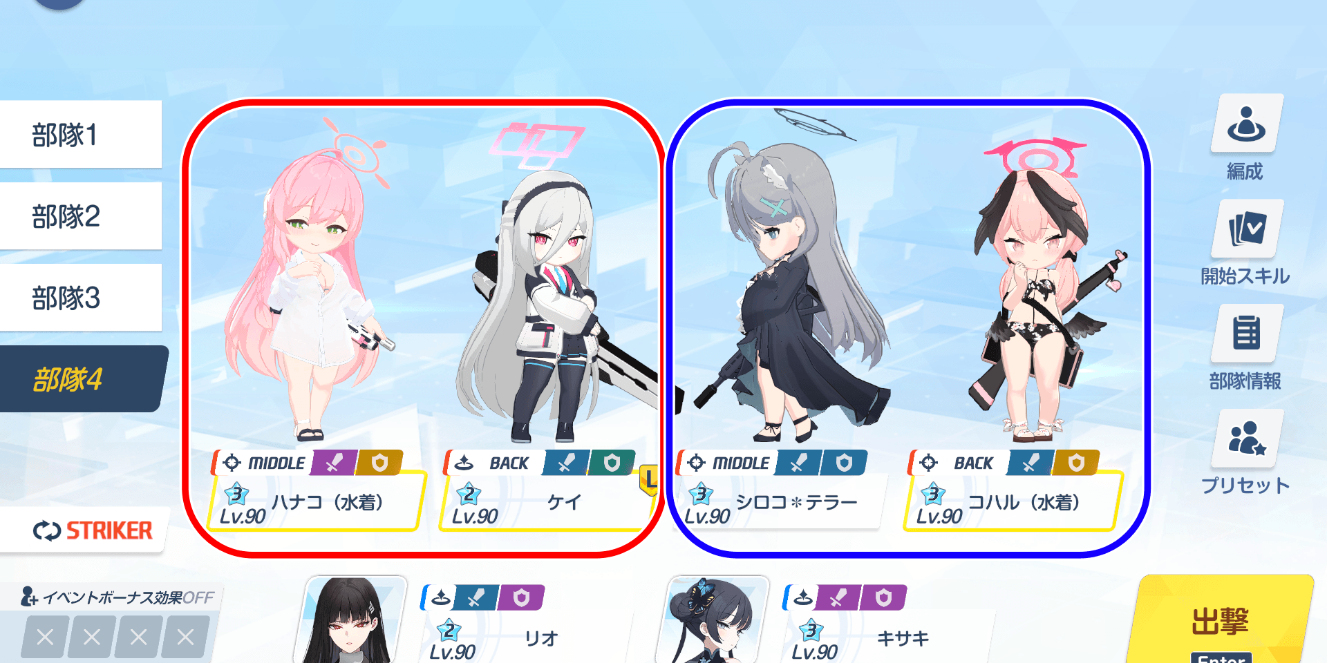 敵の弱点を突ける、神秘の範囲アタッカーを編成しよう。神秘ではないが水着ハナコが使いやすく、所持しているならおすすめ。シロコテラーは範囲アタッカーではないが、体力の多い敵を素早く削れる。