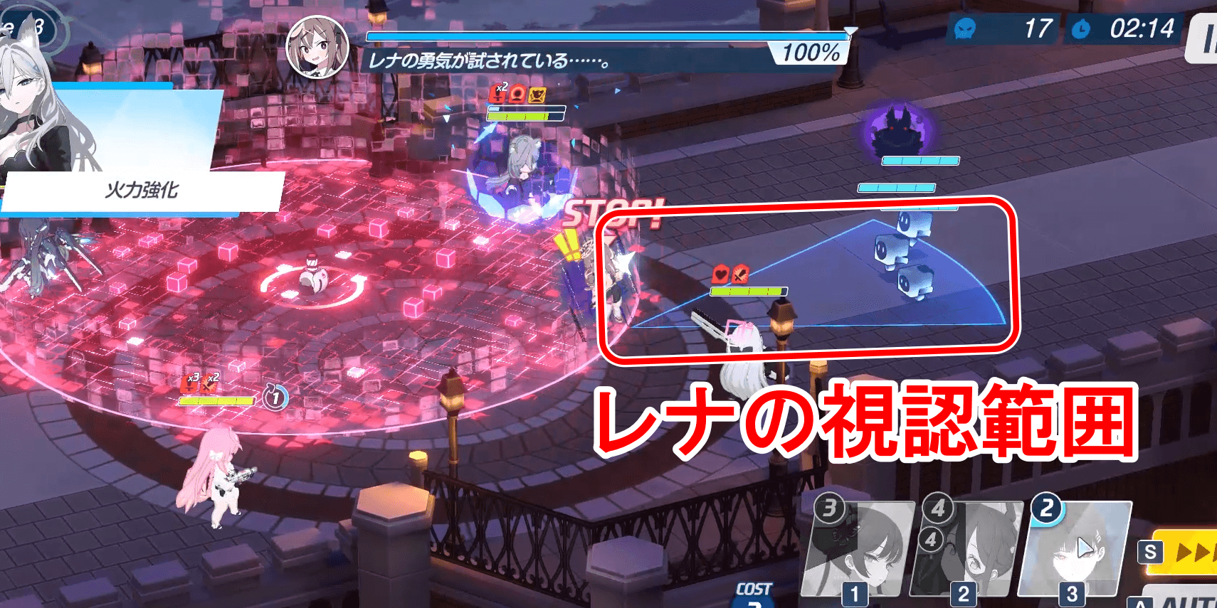 レナは常に前後に動き、前方の範囲内に敵を視認すると勇気が減少する。レナの向いている方向の敵を優先して倒し、勇気の減少を極力抑えよう。なお、レナに「STOP!」の文字が出ているが、動きは止められずHP回復は効果が無い。