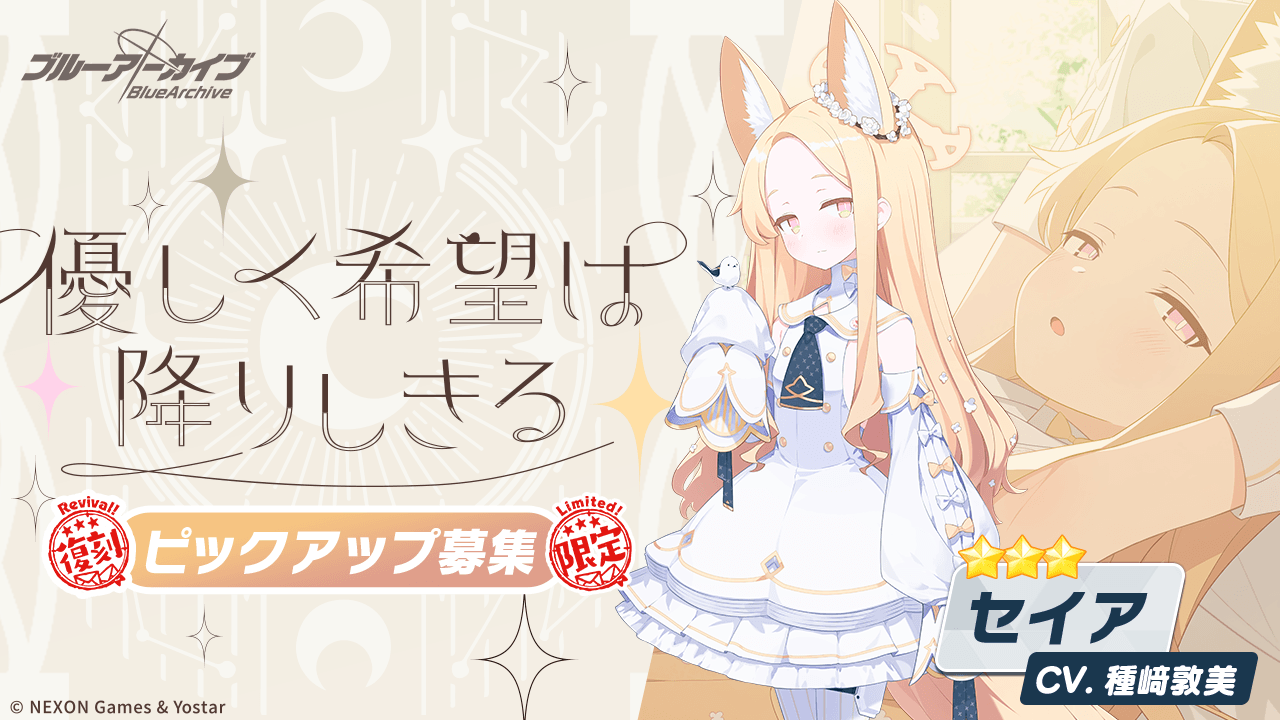 セイアは限定キャラで、今回のPUを逃すと約1年近く入手手段がなくなるのも、確保優先度が高い理由の1つです。同じ役割のキャラは複数いますが、セイア独自は強みが多いため代用は利きにくいです。