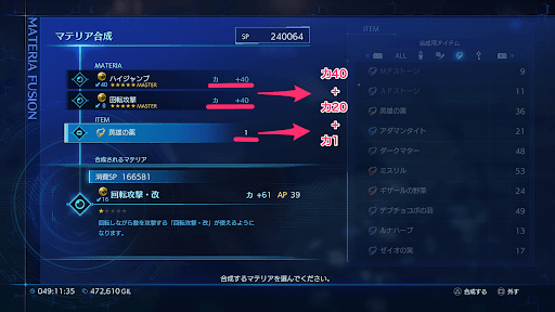 マテリア合成結果時に英雄の薬を合成すると、補正値の種類が必ず力に変わる。力カンストマテリアを作りたい場合、精神や魔力など他パラメータの補正値を上げ、最後に英雄の薬を合成して補正値の種類を力に変えよう。