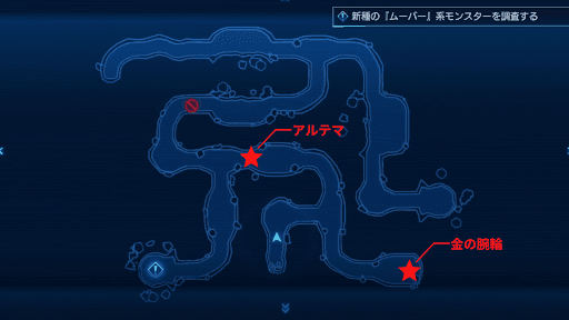 ミッション「新種を調査せよ」は、マップ移動のあるミッション。討伐対象の敵が居る場所まで遠くないので迷うことは無いが、マップ上に2つ宝箱が存在するため、目的地に着く前に必ず入手しておこう。