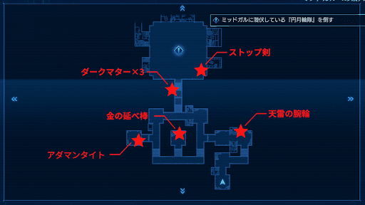 ミッション「ミッドガルへの潜入」は、マップ移動のあるミッション。討伐対象の敵が居る場所まで遠くないので迷うことは無いが、マップ上に5つ宝箱が存在するうえ、今回のミッションで入手できる宝箱は、貴重なアイテムが多い。目的地に着く前に必ず入手しておこう。