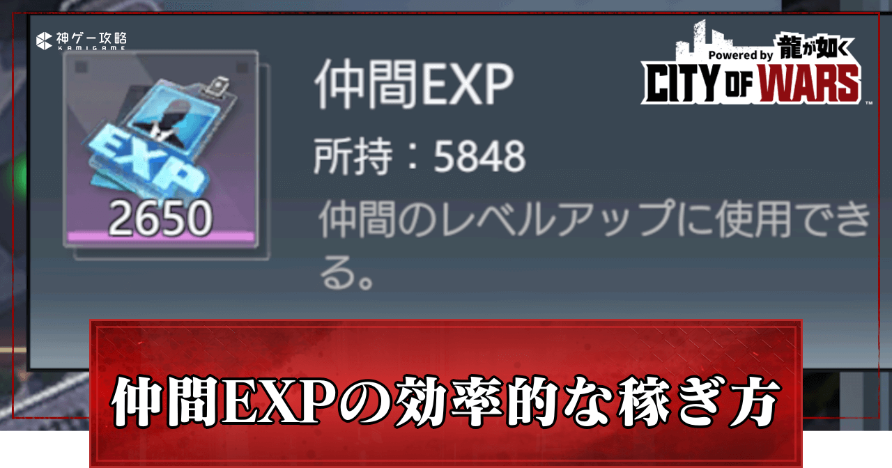 シティオブウォーズ(CW龍)のキャラ経験値である「仲間EXP」の効率的な稼ぎ方を紹介。経験値の稼ぎ方まとめや使い道についても掲載しているため、シティオブウォーズでキャラの経験値について知りたい時の参考にどうぞ。