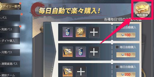 シティオブウォーズでは、様々なコンテンツで無料報酬を受け取れる。ログインボーナスや登龍門などの無料報酬や、時間経過で蓄積されるアイテムは忘れずに受け取ろう。ログインボーナスや7d報酬などは画面左上のアイコンから表示できる。
