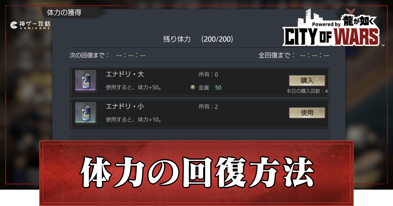 シティオブウォーズ(CW龍)の体力の回復方法と使い道を紹介。時間経過で回復する体力の量や体力を消費するコンテンツについても掲載しているため、シティオブウォーズで体力の回復方法について知りたい時の参考にどうぞ。