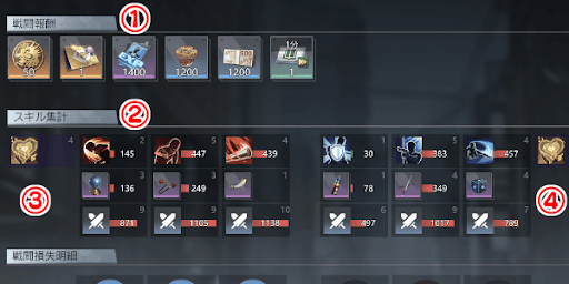 | ② | スキル集計 ※右上の数値は発動回数 ※中央の数字は発生ダメージ量・発生回復量 |