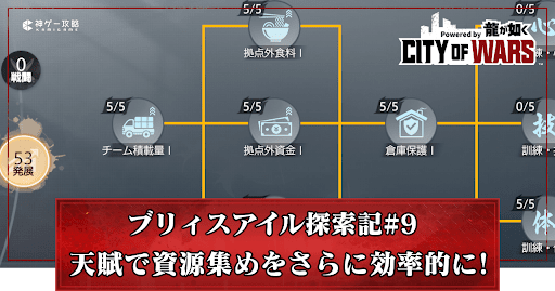 シティオブウォーズ(CW龍)の面白さを伝えるため、リアルをお伝えする攻略班プレイ日記「ブリィスアイル探索記」第9回!今回は天賦で資源集めがしやすくなる方法について触れています。CW龍をプレイする時の参考にどうぞ!