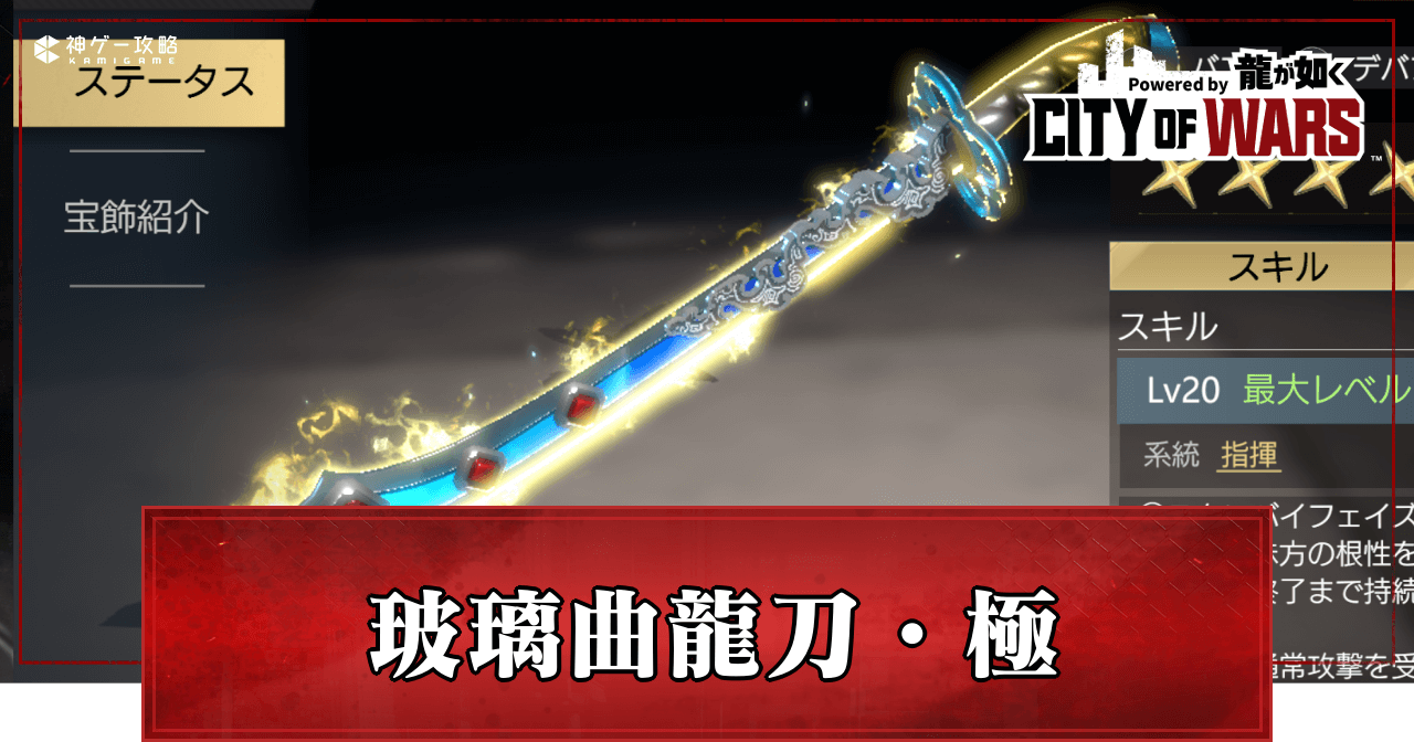 シティオブウォーズ(CW龍)の玻璃曲龍刀・極の性能と評価を紹介。玻璃曲龍刀・極のスキルの詳細だけでなく相性の良い仲間、宝飾についても掲載しているので、シティオブウォーズの玻璃曲龍刀・極について知りたい時の参考にどうぞ。