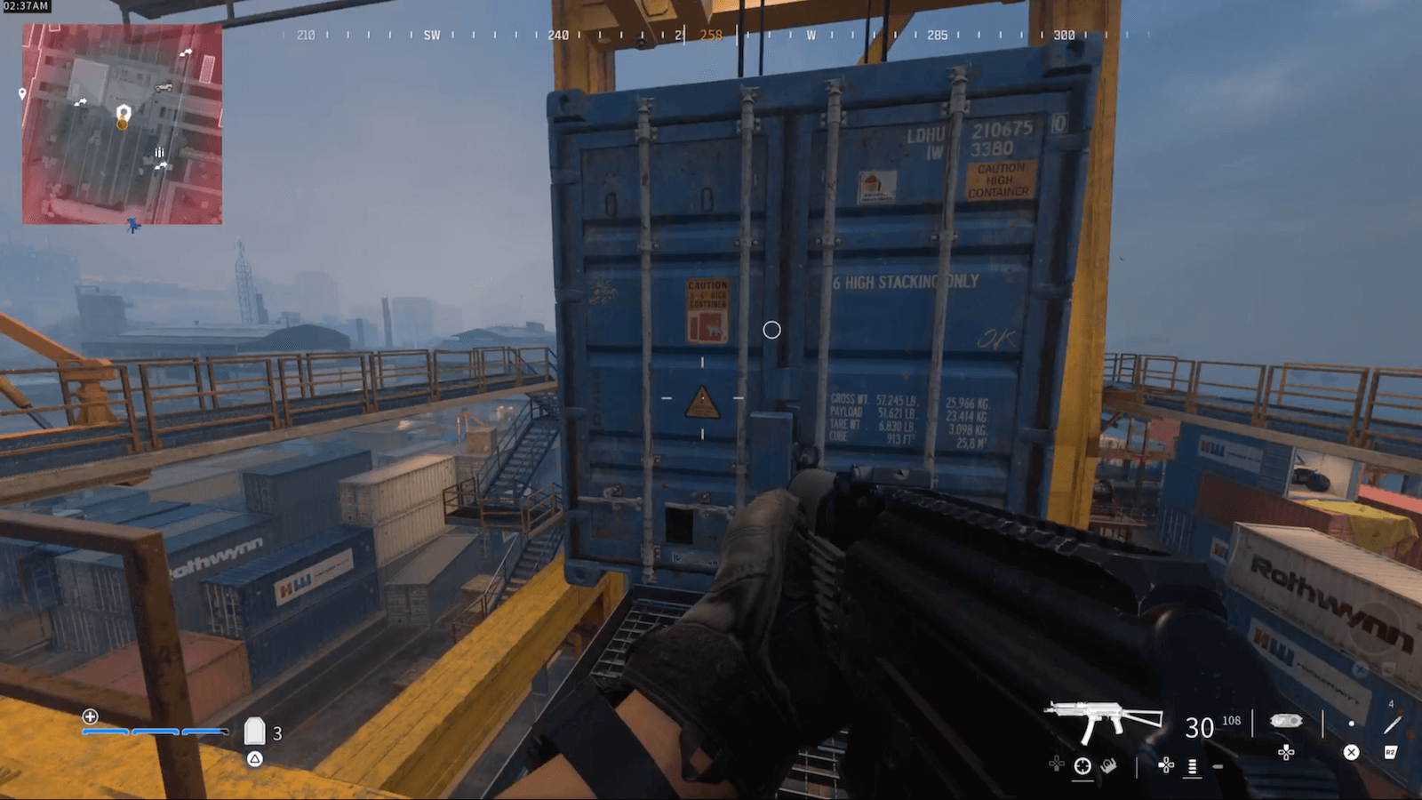 時間経過で会話が進むと目標地点が表示され、目標地点のコンテナから装備を回収可能になる。中にはアサルトライフルやグレネード、被ダメージを肩代わりしてくれるアーマーが入っており、一通りの装備が整う。また、エリア各地にも装備が配置されているため、見つけたら装備を整えておこう。