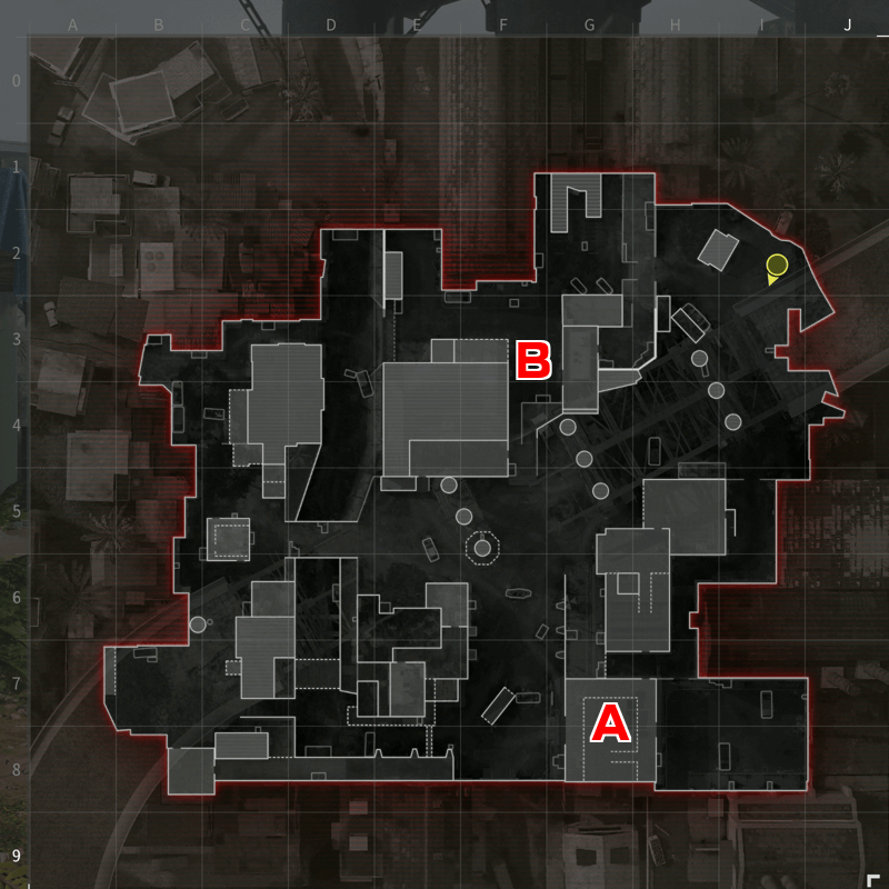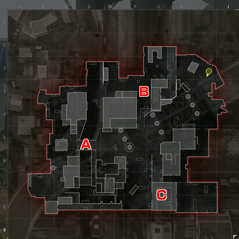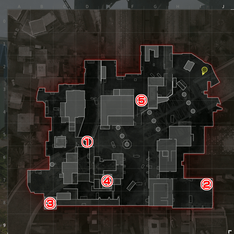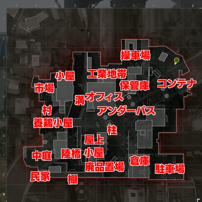 倉庫も、アンダーパスの強いポジションだ。2階3方向の窓から一方的に撃ち下ろせるため、キルを量産できる。特に駐車場がハードポイントになった際は敵が集まるため、早めに取っておこう。