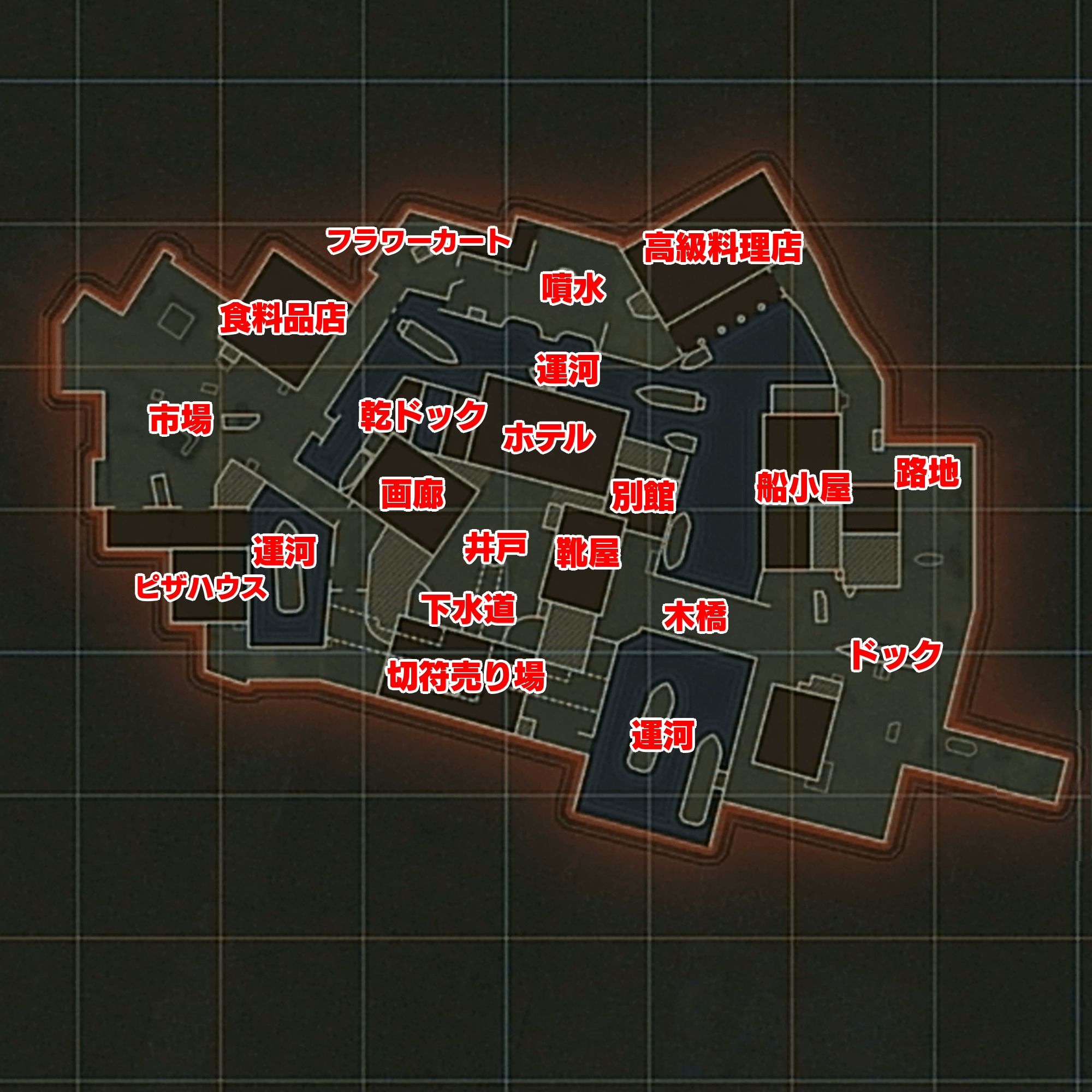 ホテルの2階は、ロータウンにおける強いポジションだ。運河越しに噴水周辺を見下ろせるため、上からキルを狙いやすい。また、ホテルには複数の窓があるため、別の窓から覗けば高級料理店や船小屋も見下ろせる。