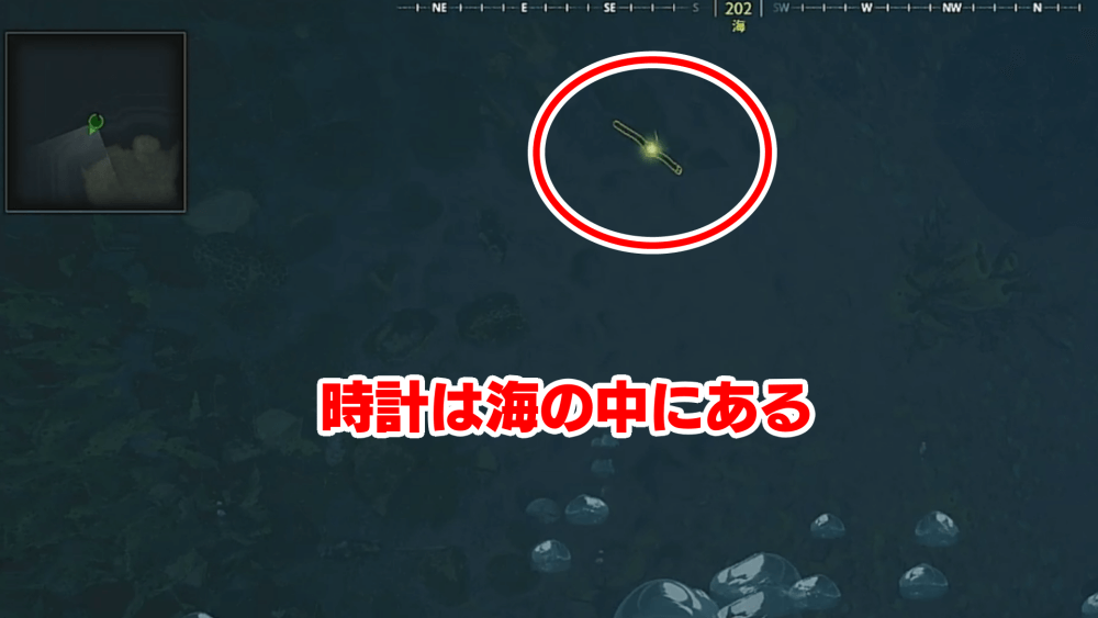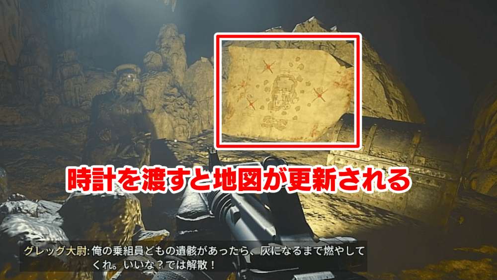 地図 時計 壁を壊すと宝箱の横に「×」印のついた地図があるため、地図頼りに時計を探し、海底に落ちている時計を見つける。「×」印の場所はマッチにより異なるので、時計を探しに行く際に確認を怠らないようにしよう。