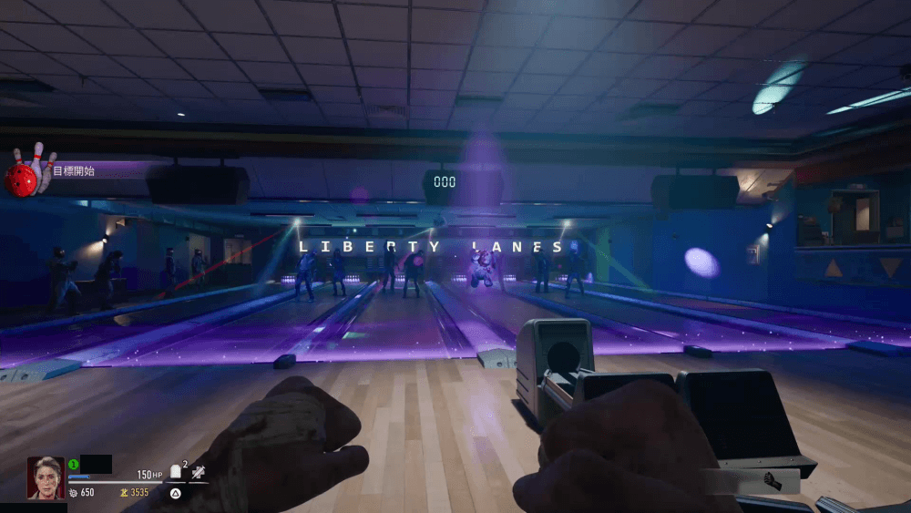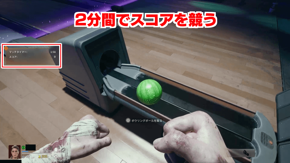 ボウリング場にテレポートすると、ボウリングのミニゲームが開始する。全員にボールが配られるので、射撃ボタン長押しでチャージしてボールを投げよう。狙うのはピンではなく、レーンの上をふらついているゾンビを倒すとポイントが加算されていく。