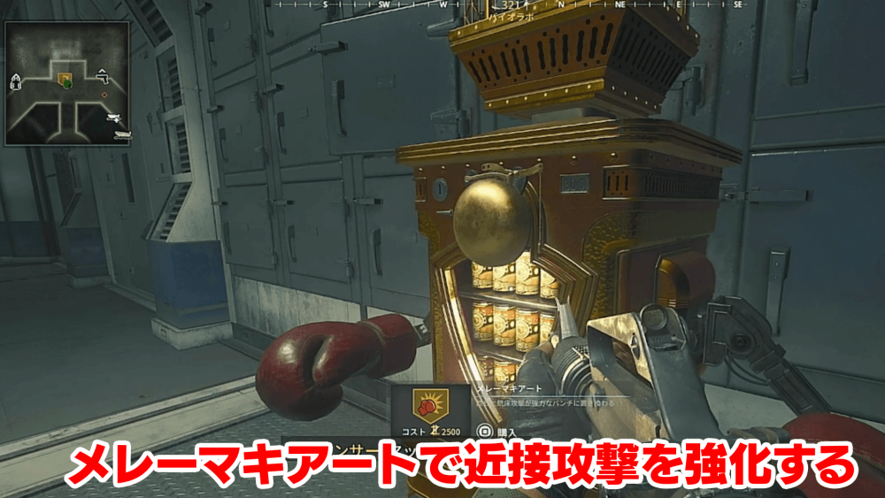 マップ 外観 近接攻撃が強化される、「メレーマキアート」のパークアコーラを飲もう。メレーマキアートの自販機はバイオラボにあるため、同時にパック・ア・パンチの解放も行っておくと良い。
