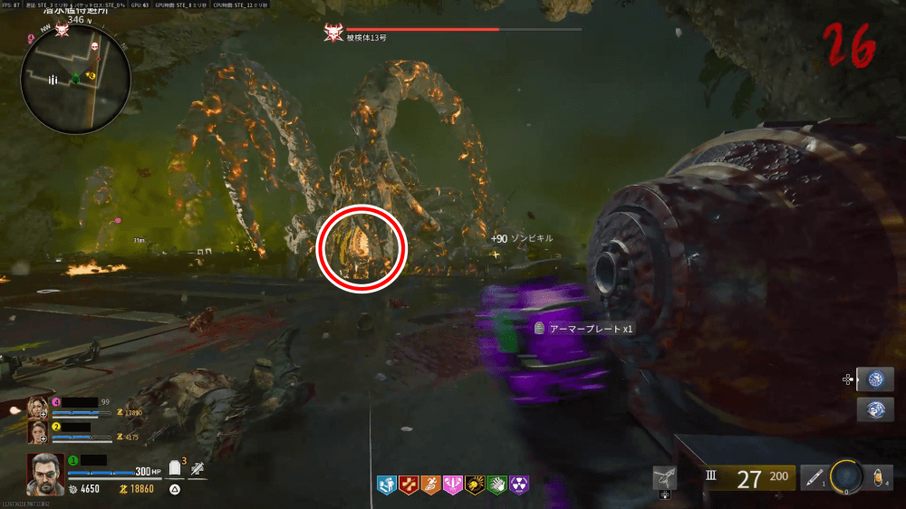 第3フェーズではアマルガムなどの強力なエリートゾンビが出現するようになるほか、ボスの攻撃も苛烈さを増すため、ヘリガンナーで一気に削るのがおすすめ。第3フェーズ開始直後の敵が少ない間は弱点部位である目を攻撃し、アマルガムが出現したタイミングでスコアストリークを使うと良い。